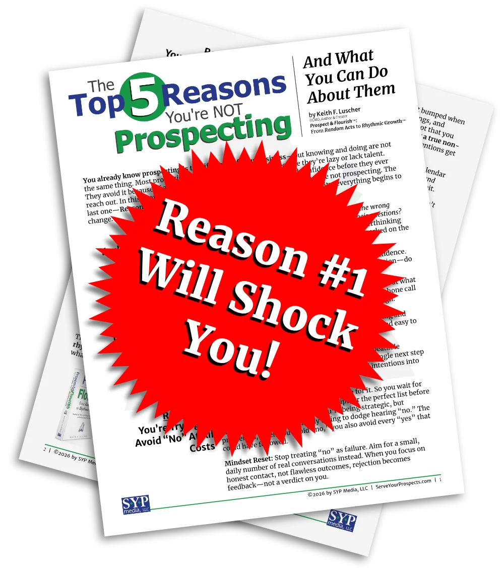 I’m Keith Luscher, creator of Prospect & Flourish™ and the Serve Your Prospects™ weekly feature on LinkedIn. For more than three decades I’ve worked in sales, marketing, and training—helping professionals in financial services, insurance, consulting, and other B2B fields build business without becoming someone they’re not.